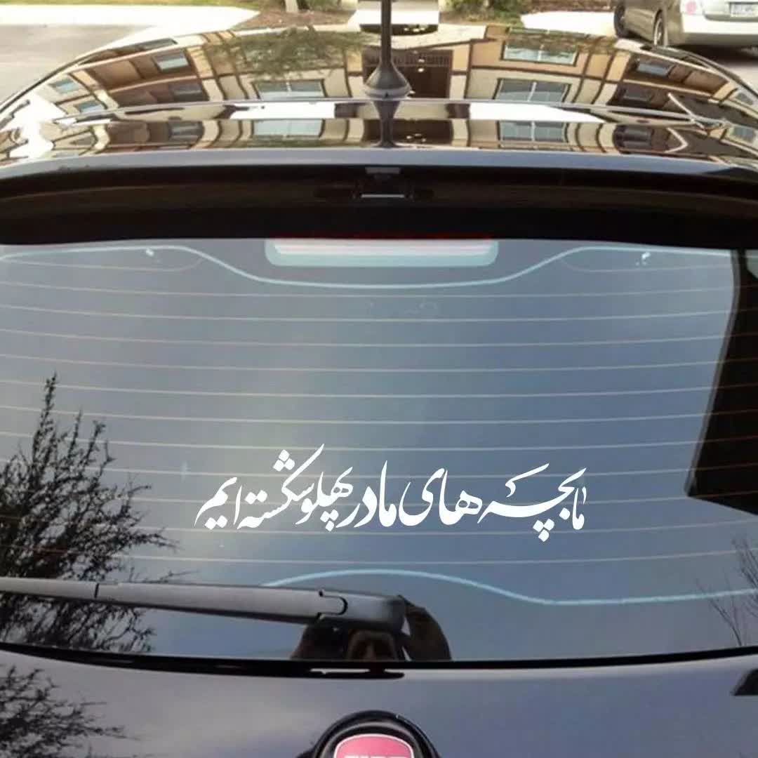 استیکر شیشه خودرو با شعار مابچه‌های مادرپهلوشکسته‌ایم با خط نستعلیق